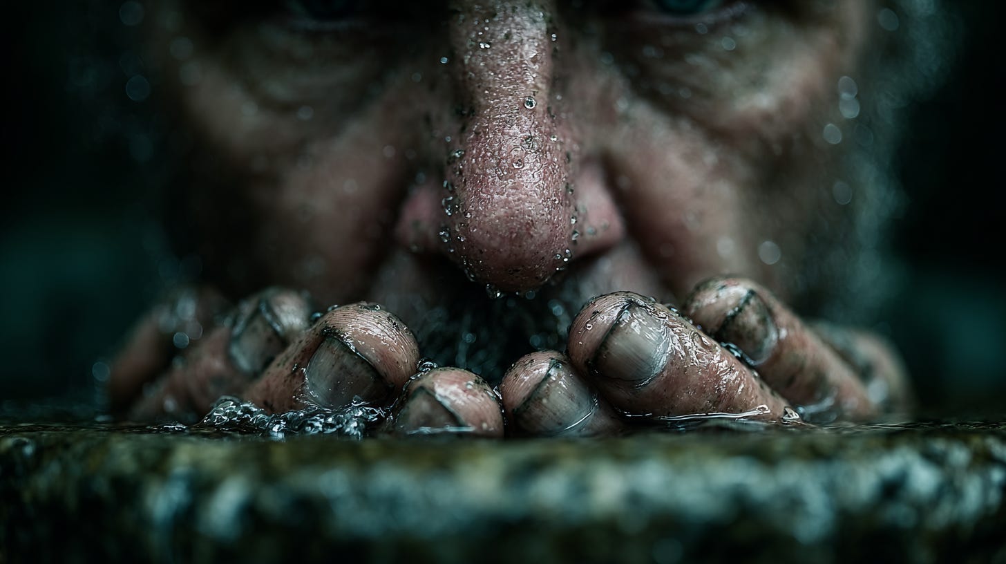 He sits at the edge. His hands hover over the water. Cup the air above it. The weight his body insists exists.